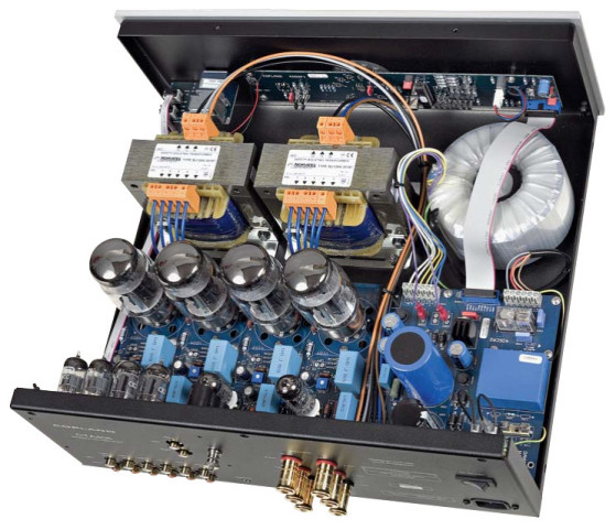 Duży transformator toroidalny jest wspólny dla obydwu kanałów. Oprócz tego dużo miejsca zajmują dwa inne trafa pracujące w układzie wyjściowym, jak informuje producent: o bardzo szerokim, sięgającym 100 kHz pasmie. Stopień mocy oparto na czterech lampach KT88 (po dwie na kanał).