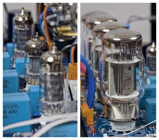 Tetrody są w stanie wygenerować ok. 100 W mocy, jednak w zastosowanej aplikacji 50 W. Przedwzmacniacz jest również lampowy - tutaj pracuje komplet 12BH7/12AX7.