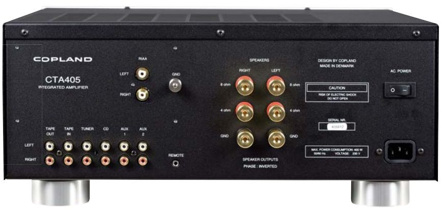 Wzmacniacz Copland CTA 405 ma pięć wejść liniowych (w tym jedną pętlę dla rejestratora) oraz odsunięte od tego szeregu wejście dla gramofonu analogowego (wkładki MM lub MC). Wszystkie gniazda są oczywiście złocone, jednak para "analogowa" na ich tle zdecydowanie wyróżnia się jakością.