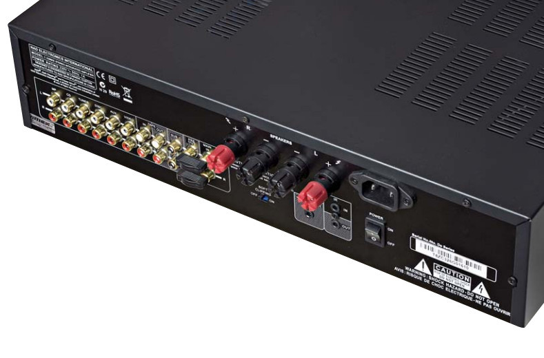 Obok widać "regularne" wyjście z przedwzmacniacza i spięte zworami wejście na końcówkę. Zaciski głośnikowe występują w pojedynczym zestawie, pod nimi umieszczono gniazda mini-jack dla triggerów i czujnika podczerwieni, a obok przełącznik, którym możemy aktywować układ soft clipping. Podobnie jak w 550A, wraz z gniazdem IEC pojawia się mechaniczny włącznik sieciowy.