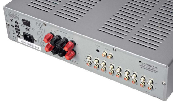 Z tyłu Cambridge Audio AZUR C 550A widać sporo gniazd - dwa komplety przyzwoitych, zakręcanych, choć plastikowych, głośnikowych, sześć wejść liniowych, dwa wyjścia do nagrywania oraz wyjście z przedwzmacniacza.