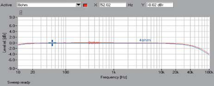 Marantz generuje dość wysokie szumy: S/N to tylko 79 dB, dzięki czemu dynamika zatrzymuje się tuż przed pułapem 100 dB. Pasmo przenoszenia (rys.1) zdradza tylko delikatną słabość w zakresie wysokotonowym, powyżej 30 kHz rozpoczyna się spadek, -3 dB przypada na 80 kHz (8 omów) i 74 kHz (4 omy), na drugim skraju wzmacniacz radzi sobie wybornie (-0,7 dB przy 10 Hz).