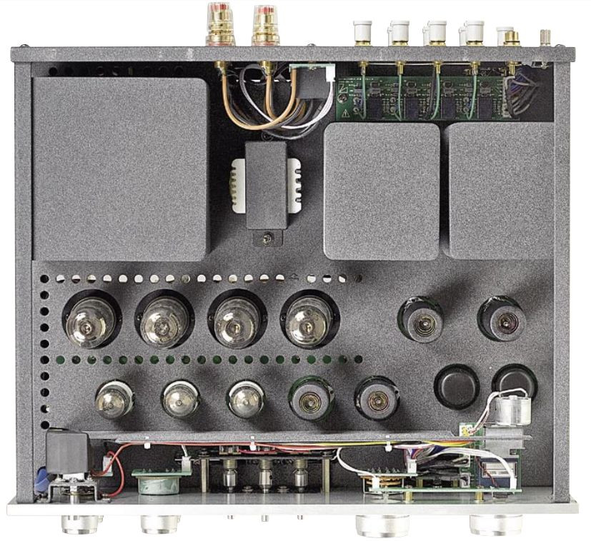 Na górze mamy wszystkie lampy, transformatory w dużych puszkach oraz przełączniki i regulator siły głosu. Ten ostatni to klasyczny potencjometr Alps "Blue Velvet", umieszczony tuż za selektorem wejść, na wejściu przedwzmacniacza. Selektor wejść jest mechaniczny, otwarty, ale steruje przekaźnikami umieszczonymi na małej płytce, tuż przy wejściach.