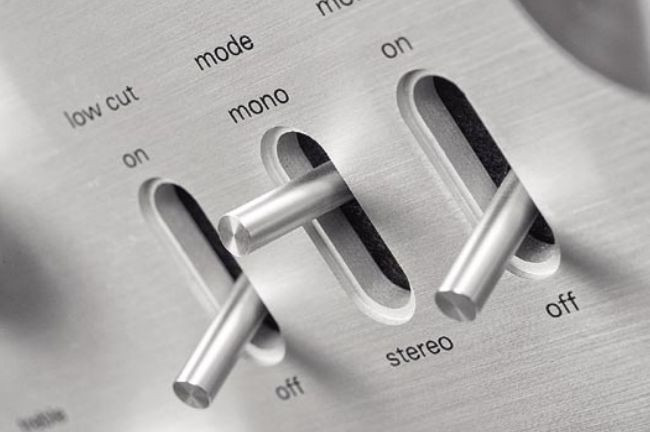 Przełączniki pośrodku zmieniają sygnał na monofoniczny, odcinają bas poniżej 30 Hz (to dla kiepskiej jakości gramofonów) i włączają pętlę magnetofonową w tryb monitorowania.