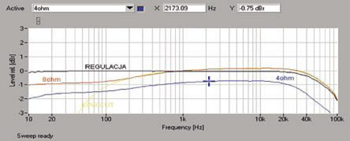 Czułość dobrano na wzorowym poziomie 0,19 %, odstęp od szumów wynosi 87 dB i jest - jak na lampowca - bardzo dobry, dynamika nie może wzbić się na wyżyny z powodu niskiej mocy, ale - co zachęcające - pokonuje barierę 100 dB. Pomiar pasma przenoszenia (rys.1) jest tym bardziej rozwinięty, podstawowe charakterystyki 8 i 4 omy wykonano przy wyłączonych filtrach i ustawieniu regulacji barwy w pozycjach teoretycznie neutralnych. Widać bardzo szerokie pasmo, od 10 Hz (-1 dB) aż do 100 kHz (-2,2 dB), ale także błędy (?) w kalibracji regulatorów barwy, które skutkują obniżeniem poziomu niskich tonów i podbiciem góry. Łatwo sobie jednak z tym poradzić - niskie tony ustawiamy na okolice godziny 12:30, wysokie na 11:40, uzyskując wówczas wyrównaną charakterystykę (oznaczoną kolorem czarnym). Natomiast kolor żółty ilustruje pracę systemu Low-Cut.