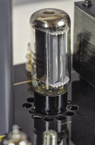 Oznacza to przeprowadzany w fabryce proces parowania (w przypadku lamp rozrzut parametrów jest znacznie większy niż w tranzystorach). Następnie sygnał trafia do lamp 12BH7A. W urządzeniu znajduje się jeszcze lampa 5U4GB, która jednak nie jest już częścią toru sygnałowego, a jej zadanie polega na przygotowaniu napięcia zasilającego dla stopni wyjściowych opartych na komplecie 300B.