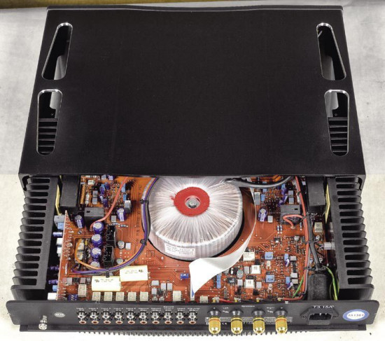 Do radiatora przykręcono też czujniki temperatury - wzmacniacz Rega Elicit wyposażono w automatyczne zabezpieczenia przed przegrzaniem, napięciem stałym na wyjściu oraz przed przesterowaniem. Pośrodku, w wycięciu drukowanej płytki, umieszczono solidny transformator toroidalny.