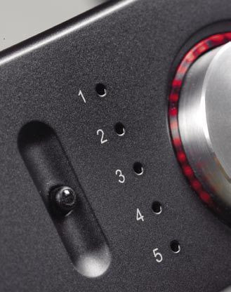 Poziom siły głosu jest kontrolowany przez mikroprocesor, pobierający informacje z enkodera sprzężonego z gałką. Obok niej mamy w pionie pięć małych diod LED, wskazujących wybrane źródło, a dalej przycisk, którym je zmieniamy.