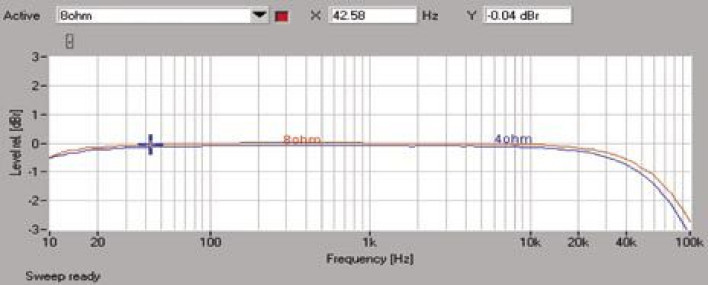 Pod względem pasma przenoszenia (rys.1.) AMS35i mieści się w granicy -3 dB przy 100 kHz dla 8 omów, dla 4 omów niewiele mu do tego brakuje, przy 10 Hz wszystko jest w najlepszym porządku (-0,5 dB). Czułość urządzenia jest bardzo wysoka - wynosi 0,13 V.