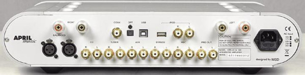 Oprócz wymienionych wejść mamy jeszcze wyjście z przedwzmacniacza i wyjście do nagrywania. Gniazda dla kanałów lewego i prawego ustawione są nie w pionie, ale w poziomie.