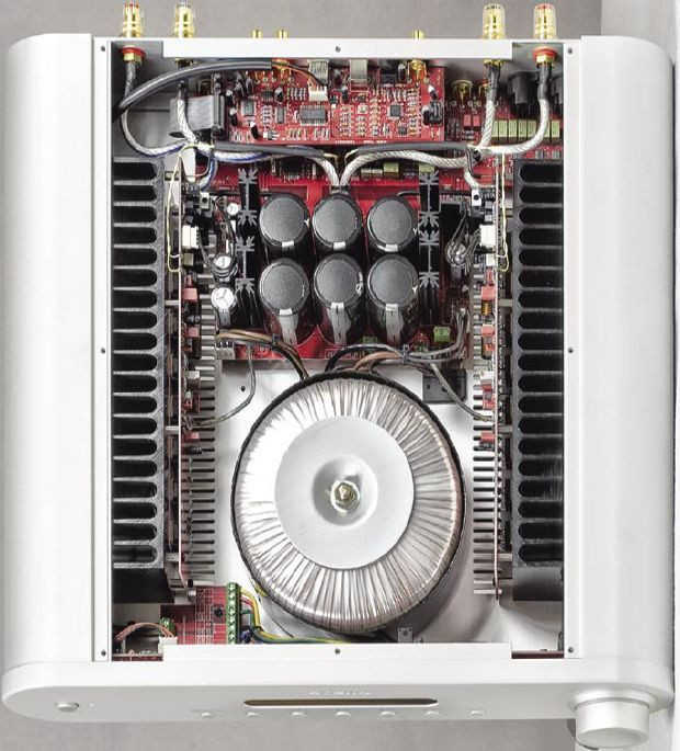 Pomiędzy końcówkami znajduje się zasilacz, a jego podstawą jest bardzo duży transformator toroidalny o mocy 800 W, z którego wyprowadzono osobne uzwojenia dla różnych sekcji. Filtrację zapewnia sześć dużych kondensatorów o łącznej pojemności 90 000 mikrofaradów.