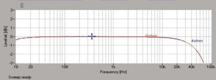 Sam producent deklaruje trochę mniej (90 W). Zapowiada też, że chociaż kolumny 4-omowe mogą zostać podłączone, to nie należy spodziewać się spektakularnego wzrostu mocy, która przy takim obciążeniu powinna wynosić 120 W. Tak też się dzieje (uzyskaliśmy dokładnie 119 W), a w stereo 2 x 116 W. Czułość jest wzorcowa, wynosi dokładnie 0,2 V. Wzmacniacz generuje dość wysoki szum, wskaźnik S/N osiągnął tylko 75 dB, a przez to dynamika zatrzymała się na pułapie 95 dB. Pasmo przenoszenia (rys. 1.) rozciągnięte jest bezproblemowo w zakresie niskotonowym (przy 10 Hz spadek zaledwie -0,3 dB), ale na drugim skraju -3 dB pojawiają się dość wcześnie, przy 69 kHz. W spektrum zniekształceń (rys. 2.) wyróżnia się tylko druga harmoniczna, której poziom to jednak wciąż dość niskie -87 dB, kolejne leżą już poniżej -90 dB.