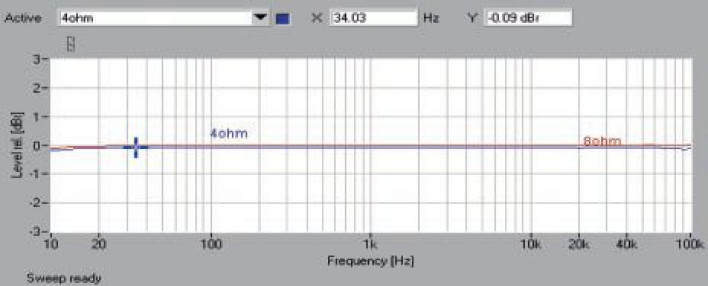 Dzięki konstrukcji dual-mono, wartości mocy przy dwóch wysterowanych kanałach nie ulegają zmianie. Bardzo niska czułość wynosząca 1,6 V wymaga zastosowania dobrego przedwzmacniacza aktywnego. Szumy są bardzo niskie, odstęp -98 dB należy do najlepszych ze zmierzonych wartości w naszym laboratorium, dynamika sięga 119 dB. Przebieg charakterystyki przenoszenia (rys.1.) jest idealny, jakby narysowany od linijki w całym mierzonym przez nas pasmie (od 10 Hz do 100 kHz), zarówno dla 8 jak i 4 omów. Spektrum zniekształceń (rys. 2.) potwierdza mistrzowską formę, najsilniejsza trzecia harmoniczna ma bardzo niski poziom -96 dB, drugą widać jeszcze przy -98 dB, następne poniżej -100 dB.