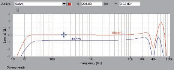 Poziom THD+N poniżej 0,1 % jest przekroczony w całym zakresie mocy (rys. 3), sytuacja wygląda nieco lepiej przy obciążeniu 8-omowym.