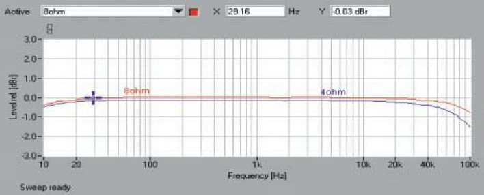 Pasmo przenoszenia (rys.1) nie zdradza najmniejszych problemów, poziom przy 10 Hz wynosi -0,4 dB, a przy 100 kHz -0,8 i -1,4 dB odpowiednio dla 8 i 4 omów. Spektrum zniekształceń (rys. 2) pokazuje tylko dwie dość niewinnie wyglądające parzyste harmoniczne - druga ma poziom -84 dB, czwarta leży o jeden decybel wyżej. Poza tym widmo jest niemal idealnie czyste.