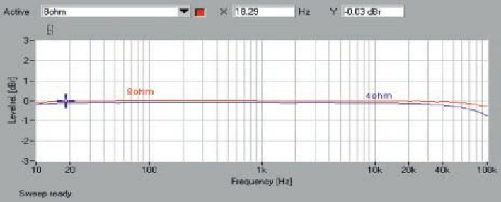 Poziom szumów jest bardzo niski - 95 dB, więc dynamika imponująco wysoka (jak na wzmacniacz o tak niskiej mocy) - 112 dB. Test pasma przenoszenia (rys.1) Audiolab pokonuje wyjątkowo gładko, przy 10 Hz w zasadzie nie widać spadku, a przy 100 kHz i 8 omach wynosi zaledwie -0,3 dB, przy 4 omach wynosi -0,7 dB.