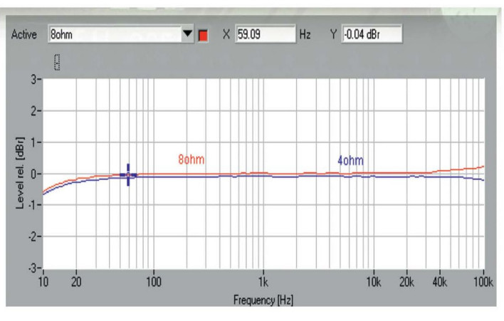 W pasmie przenoszenia (rys.1) spadek przy 10 Hz dla 8 i 4 omów wynosi -0,7 dB, a przy 100 kHz odchyłka od poziomu referencyjnego jest w granicach +/-0 .1 dB, w zależności od obciążenia nie ma o czym mówić. Spektrum zniekształceń (rys. 2) pokazuje co prawda trzecią harmoniczną, jednak jej poziom to bardzo niskie -88 dB, kolejne nieparzyste znajdują się już poniżej -100 dB.