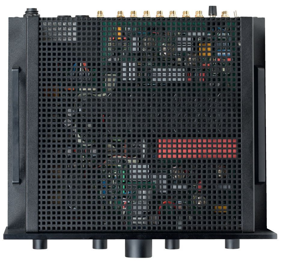 Po zdjęciu siatki zabezpieczającej zobaczymy solidny, czysty montaż na kilku płytkach drukowanych. Najwięcej miejsca zajmuje zasilacz, pomimo że transformatory wydzielono do osobnej obudowy.