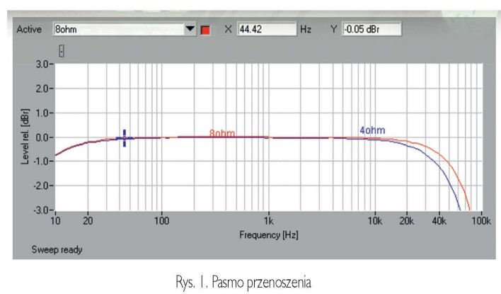 Odstęp sygnału od szumu wynosi 79 dB, dynamika sięga 103 dB. Pasmo przenoszenia (rys.1) nie budzi obaw, przy 10 Hz spadek wynosi -0,8 dB, na górze pasma spadki -3 dB możemy wyznaczyć przy 78 kHz dla 8 omów oraz 62 kHz dla 4 omów.