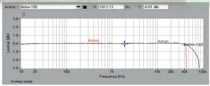 Podstawowy pomiar pasma przenoszenia (rys.1) wykonałem dla rekomendowanego ustawienia wejść analogowych (konwersja A/C 24 bit / 96 kHz) i odpowiadają mu charakterystyki dla 8 i 4 omów (odpowiednio czerwona i niebieska), które idealnie się pokrywają. Poziom przy 10 Hz wynosi znakomite -0,1 dB, spadek rozpoczyna się tuż ponad 40 kHz i dokładnie odpowiada charakterystyce zastosowanego konwertera, próbkującego przy częstotliwości 96 kHz.