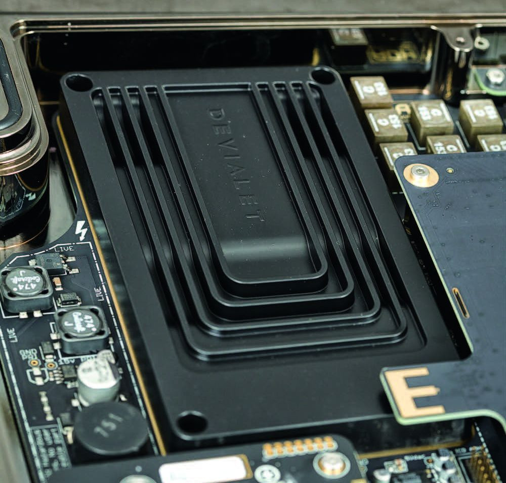 Zacznijmy jednak od początku, czyli od przedwzmacniacza. Wszystkie sygnały, jakie docierają do Devialeta, muszą być po przejściu przez moduł konfiguracyjny (decydujący o połączeniu konkretnych gniazd do wybranych sekcji) zamienione na postać cyfrową. Oczywiście dotyczy to sygnałów analogowych, te ze źródeł cyfrowych są co najwyżej upsamplowane do postaci 24 bit / 192 kHz.
