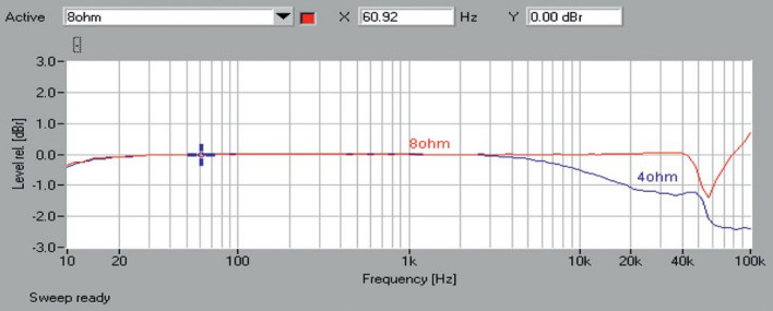 Pasmo przenoszenia (rys.1) pokrywa zakres niskich częstotliwości, przy 8-omach biegnie liniowo aż do 40 kHz, powyżej których następuje gwałtowny spadek, a potem wzbudzenie układu (umiarkowane), natomiast przy 4 omach poziom delikatnie obniża się już od 4 kHz, lecz utrzymuje powyżej poziomu -1 dB do 20 kHz i -3 dB aż do 100 kHz.