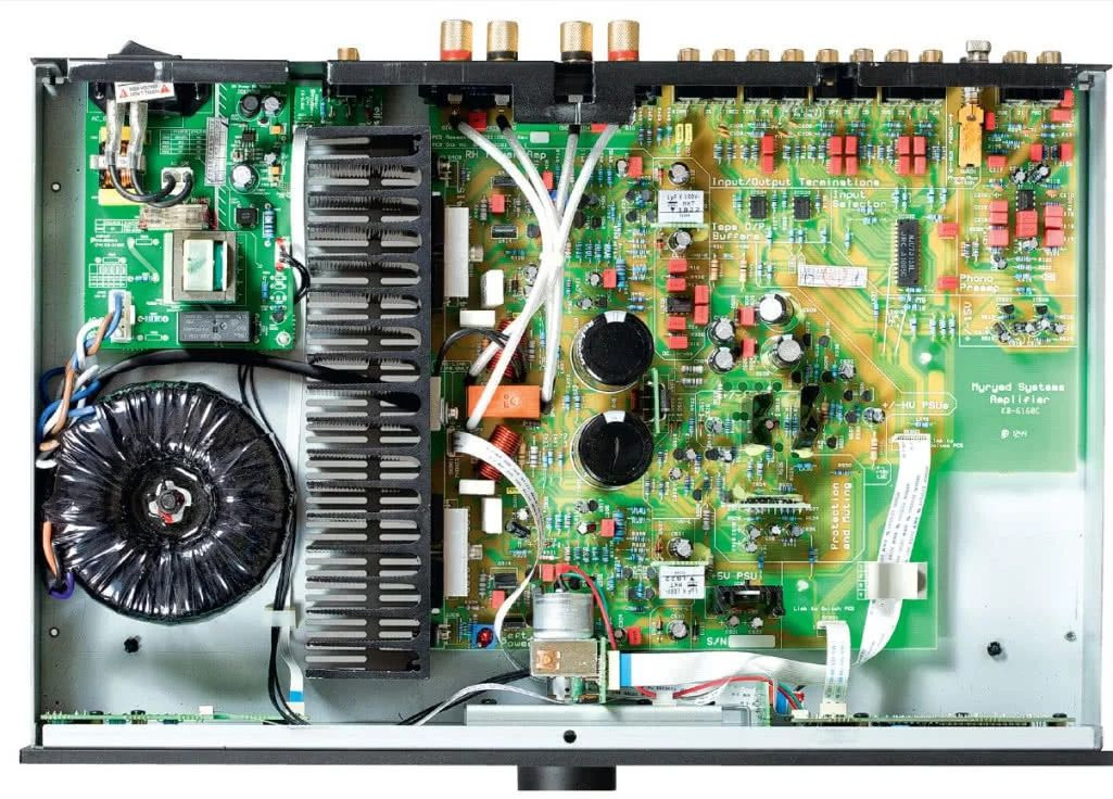 Układ elektryczny wzmacniacza Myryad Z240 przypomina klasyczne, brytyjskie wzmacniacze. Można go przedstawić jako końcówkę mocy z pasywnym przedwzmacniaczem. Wejścia są przełączane w układzie scalonym JRC i widać przy nich wysokiej klasy, przewlekane oporniki oraz kondensatory polipropylenowe Wima.
