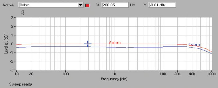 Poziom szumów nie imponuje, S/N wynosi 79 dB, zaś dynamika 95 dB, ale w tym teście były i lepsze, i gorsze rezultaty. Wzmacniacz może się pochwalić bardzo ładnym pasmem przenoszenia (rys.1), przy 10 Hz nie widać żadnego spadku, a przy 100 kHz wynosi tylko ok. -1 dB.