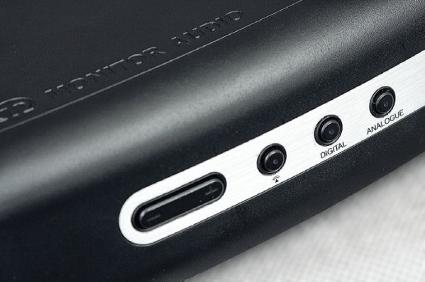 Monitor Audio A100 prezentuje się nie tyle nowocześnie, co wręcz futurystycznie. "Setka" jest jak wycięty kawałek latającego spodka, czerń (dostępna również wersja biała) uzupełniono srebrnymi wstawkami z przodu i w formie dwóch bocznych zaślepek. Wzmacniacz można położyć lub ustawić pionowo w specjalnej podstawce.