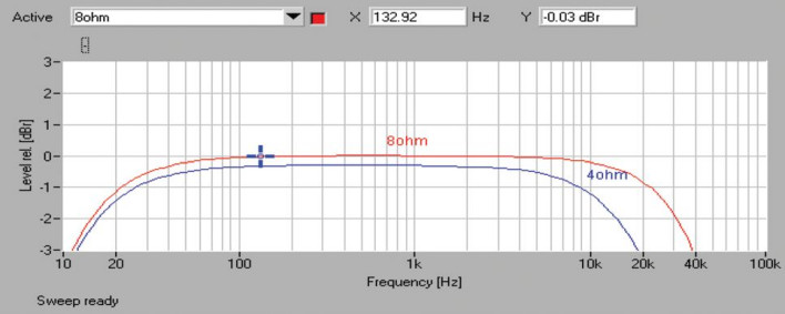 W pasmie przenoszenia (rys.1) widać spadki zarówno od strony niskich, jak i wysokich częstotliwości. Punkty -3 dB przypadają na ok. 12 Hz (spadek rozpoczyna się już od ok. 60 Hz) oraz 38 kHz dla 8 omów, w przypadku 4 omów, -3 dB pojawia się już przy ok. 22 kHz.