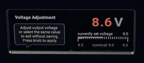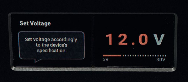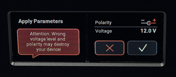 W każdym wypadku, zwłaszcza gdy samodzielnie "kręcimy" pokrętłem napięcia, Ferrum Hypsos wyśle sygnał ostrzegawczy - i nie ma w tym żadnej przesady - niewłaściwa decyzja (zbyt wysokie napięcie lub błędna polaryzacja) może doprowadzić do uszkodzenia zasilanego sprzętu.