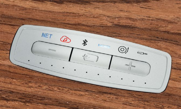 Na górnej ściance zainstalowano subtelny panel sterujący z trzema przyciskami i dwoma zestawami diodowych wskaźników. Pierwszy z nich pozwala zorientować się w ustalonym poziomie głośności, drugi informuje o wybranym źródle. I to właściwie wystarczy.